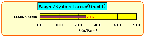 但し、レクサスGS450hのシステムトルク当たり重量は、システムトルク値として推定値80Kg.m〈(ハリアーハイブリッド825N.m;MotorMagazine Special Edition 05.5 P.6参照)を参考とした大雑把な類推値〉を用いた参考計算値である。
